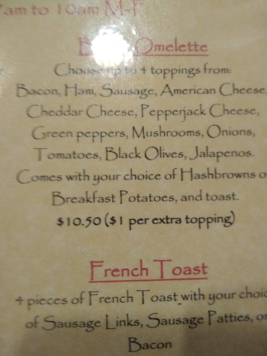 Eggs, cheese sauce, Canadian bacon, pork sausage, mozzarella cheese, cheddar cheese, bacon and three veggies of your choice