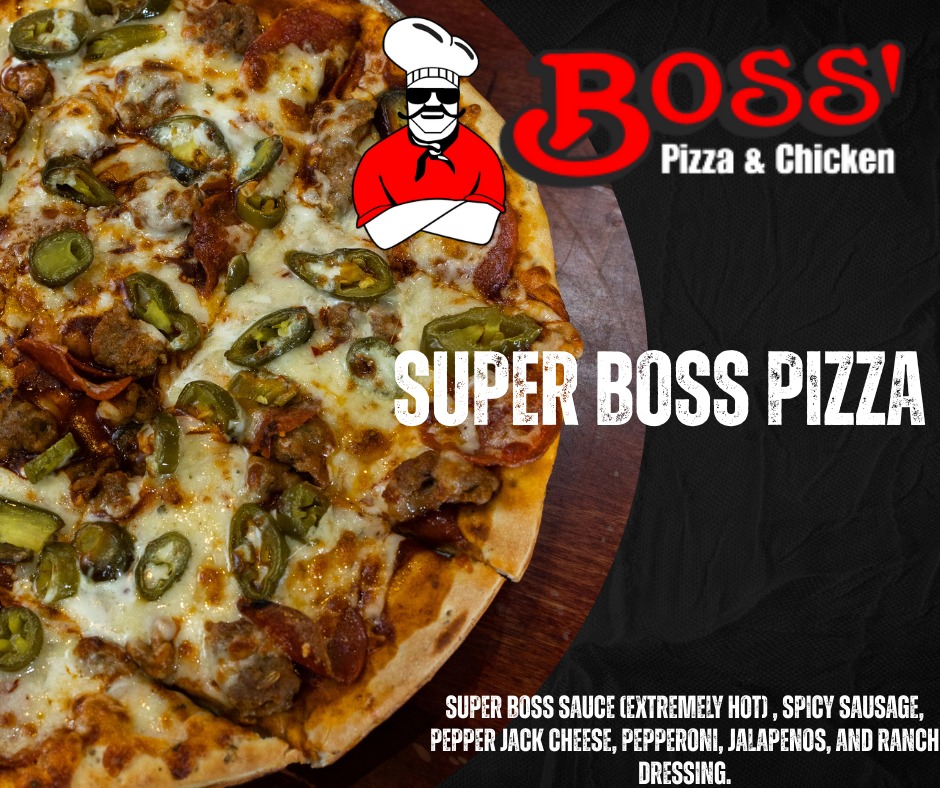 Super Boss sauce, jalapeno, spicy sausage, pepper jack, pepperoni, ranch dressing